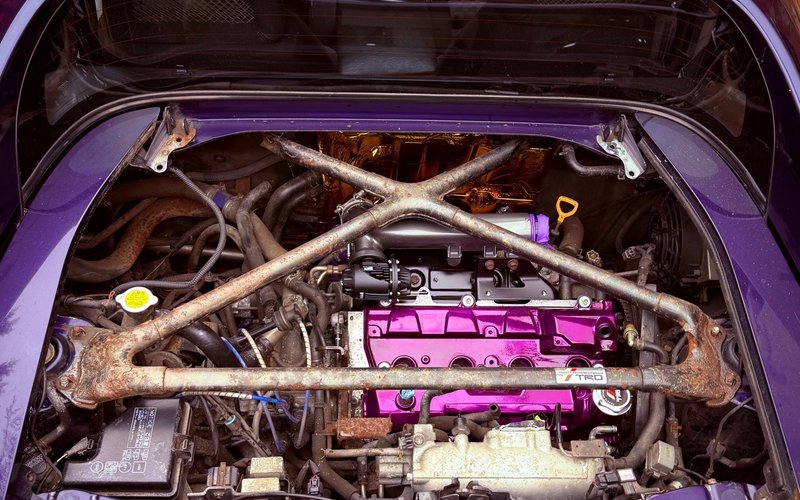 1998 Toyota MR2 Rev5 Turbo, imported from Japan. Factory colour is "Cosmos Blue", which despite the name is actually a rare purple, similar to what the US market called Mika Purple. Currently sitting at around 330hp with a host of modifications, running on white wheels. I've owned this car for years and it's been a constant project, engine out for a clutch, full engine bay strip down and repaint, paintwork correction on 28-year-old factory paint, silicone hose replacements, and plenty more still to come. It's my second MR2 Turbo (the Rev2 before it sadly lost the battle with rust), so I know these cars inside and out. This project documents everything: the teardowns, the late nights, the parts that don't fit, and the bolts Toyota hid in places no human hand should reach.